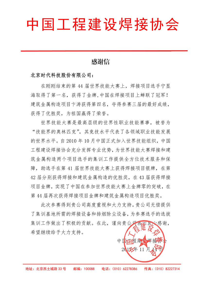 中國工程建設焊接協會感謝時代焊機提供世賽培訓用機