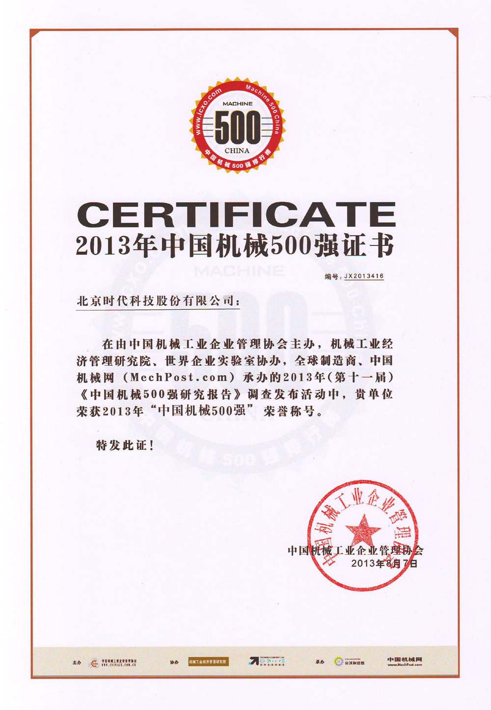 | 2013-08 | 中國機械500強 證書 | 中國機械工業企業管理協會 |