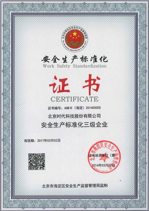 | 2014-04 | 安全生產標準化證書 | 北京市海淀區安全生產監督管理局 |